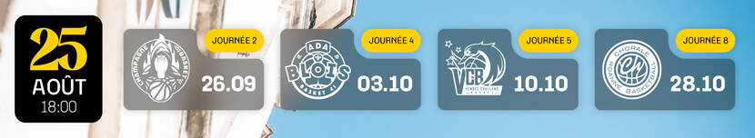 Nous vous donnons donc rendez-vous le lundi 25 août à 18h00 sur notre billetterie en ligne pour la première mise en vente des rencontres face à Châlon Reims, l'ADA Blois, Challans Vendée Basket et la Chorale de Roanne.