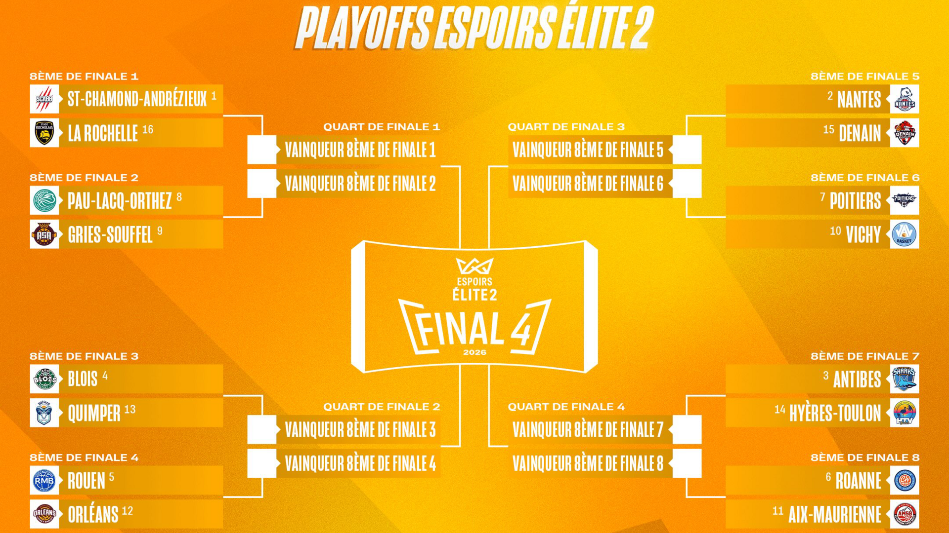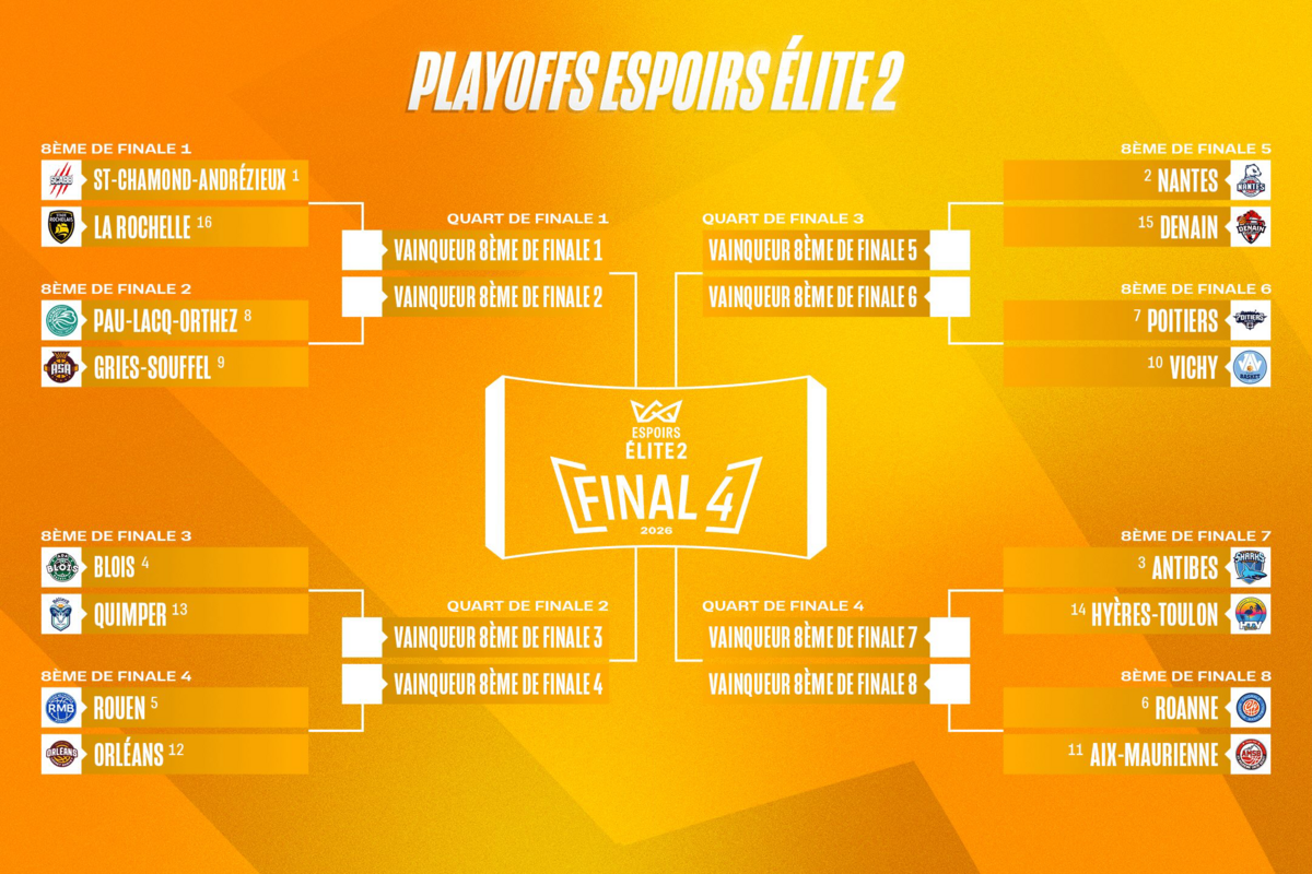 Découvrez l’ensemble des équipes qualifiées pour les playoffs Espoirs Élite 2 ainsi que les différentes affiches. Seize équipes sont en lice pour décrocher l’une des quatre places qualificatives pour le Final Four, qui se tiendra les 16 et 17 mai prochains sur le parquet de la Halle André Vacheresse à Roanne.