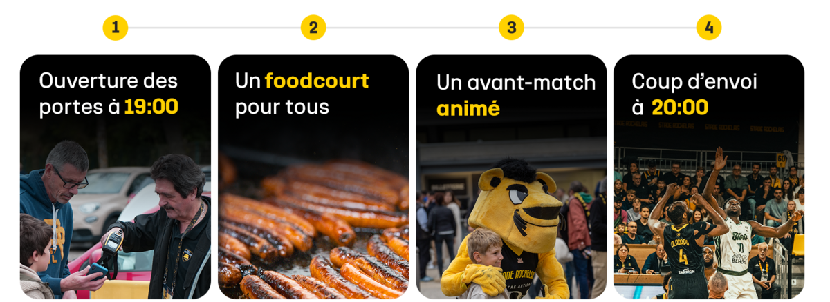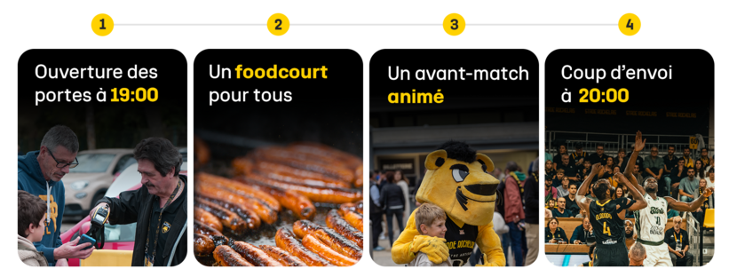 Dès votre arrivée, le parvis vous accueillera dans une ambiance conviviale et festive, avec des animations pour toute la famille ! Vous pourrez profiter de la boutique installée sur le parvis devant la Salle Gaston Neveur. Musiques, restauration, surprises et moments à partager en famille ou entre amis : tout est réuni pour passer une bonne soirée ! On vous propose un programme en quatre étapes pour votre avant-match :