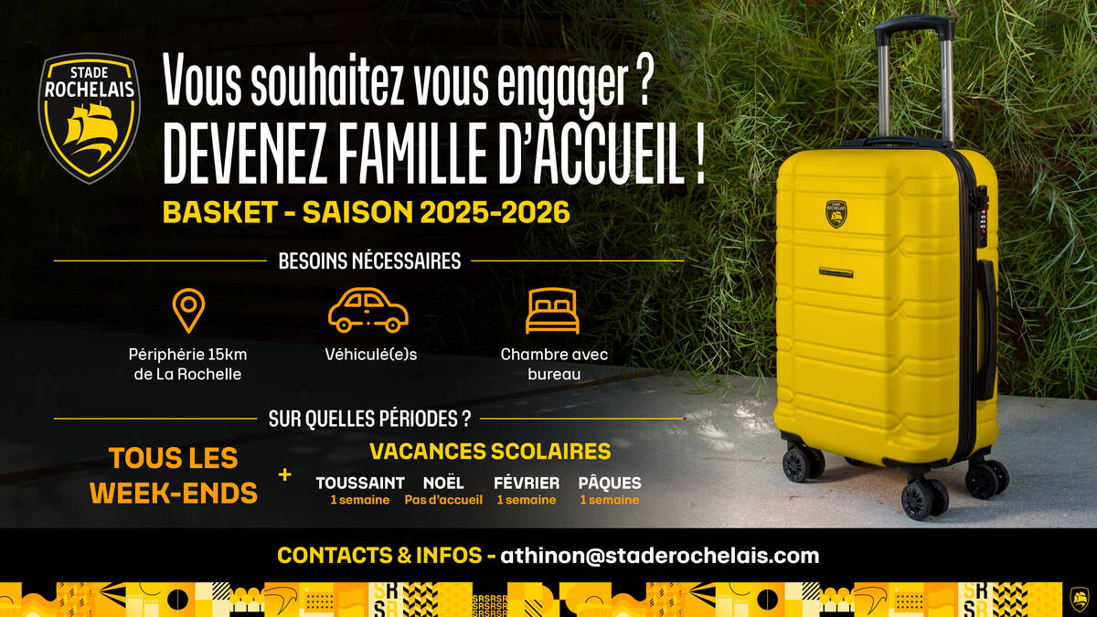 Le Stade Rochelais Basket est à la recherche de plusieurs familles d'accueil pouvant accompagner nos jeunes joueurs du Centre de Formation en les accueillant les week-ends (du vendredi soir au dimanche soir) et certaines périodes des vacances scolaires, pour la saison prochaine !