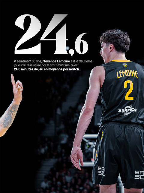 À seulement 18 ans, Maxence Lemoine est le deuxième joueur le plus utilisé par le staff maritime, avec 24,6 minutes de jeu en moyenne par match.