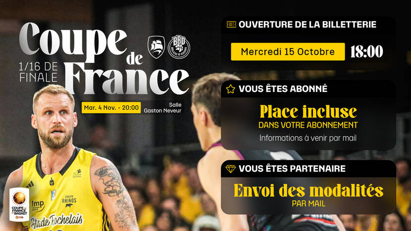 Après leur nette victoire à Challans au deuxième tour de la Coupe de France, les Jaune et Noir auront la chance de recevoir Boulazac, promu en Betclic Élite cet été, pour jouer une qualification en huitième de finale. Le match se jouera le mardi 4 novembre, à 20h00 !