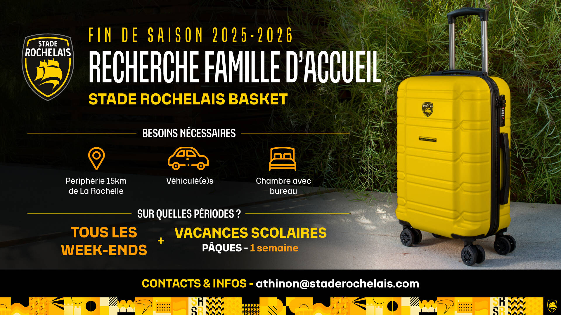Le Stade Rochelais Basket est à la recherche d'une famille d'accueil pouvant accompagner un jeune joueur du Centre de Formation en l'accueillant les week-ends (du vendredi soir au dimanche soir) et les vacances scolaires de Pâques, pour la fin de la saison !
