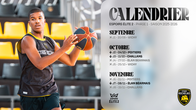 Pour cette nouvelle saison, les Rochelais évolueront dans la Poule B du Championnat Espoirs Élite 2, où ils affronteront Vichy, Poitiers, Vendée Challans et l’Élan Béarnais. Cette année il y a du changement avec un tout nouveau format mis en place avec une première phase de 10 matches aller-retour jusqu’en novembre. À l’issue de cette phase, un classement définira deux groupes de 10 équipes pour la suite de la compétition. Et si tout ça vous semble un peu flou, pas d’inquiétude : on vous explique tout ici !